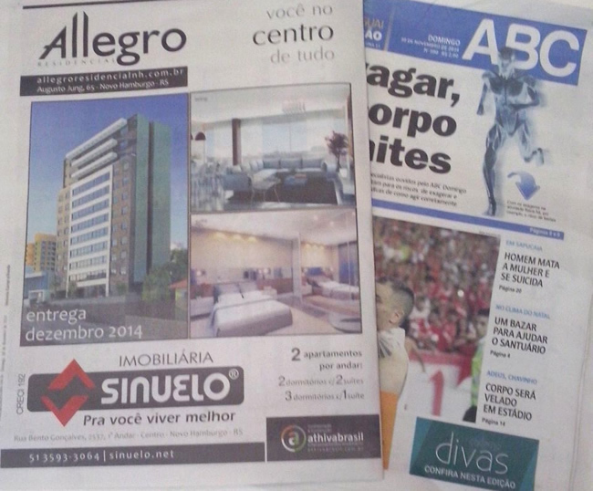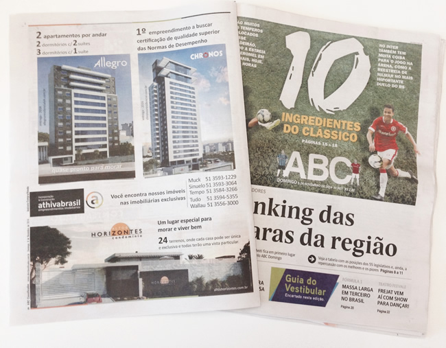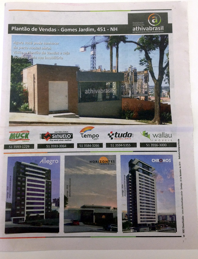 ABC Classificados de domingo, 09 de novembro, do Jornal NH com anúncio feito pela Athivabrasil Empreendimentos Imobiliários destaca seus mais novos empreendimentos: Allegro Residencial, Chronos Residencial e Altos Horizontes. Conheça mais sobre cada um deles nos links: www.allegroresidencialnh.com.br www.chronosresidencial.com.br www.altoshorizontes.com.br