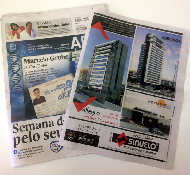 ABC Classificados de domingo, 28 de setembro do Jornal NH com anúncio feito pela Imobiliária Sinuelo dos empreendimentos Allegro Residencial, Chronos Residencial e Altos Horizontes da Athivabrasil. Conheça mais nos links: www.allegroresidencialnh.com.br www.chronosresidencial.com.br www.altoshorizontes.com.br